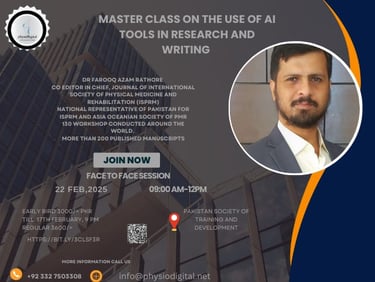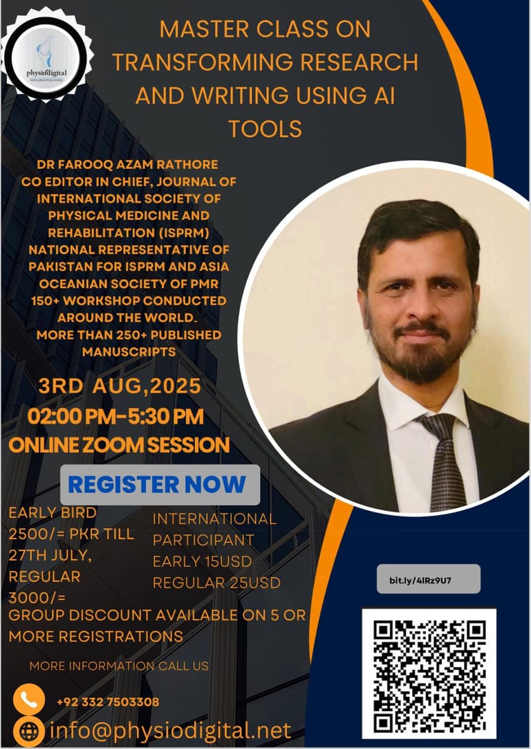 The workshop will be conducted by Dr Farooq Azam Rathore (Professor and Consultant in Rehabilitation Medicine), Co Editor in Chief, Journal of International Society of Physical Medicine and Rehabilitation (ISPRM), National Representative of Pakistan for ISPRM and Asia Oceanian Society of PMR, 150+ Workshops conducted around the world and More than 250 published manuscripts).